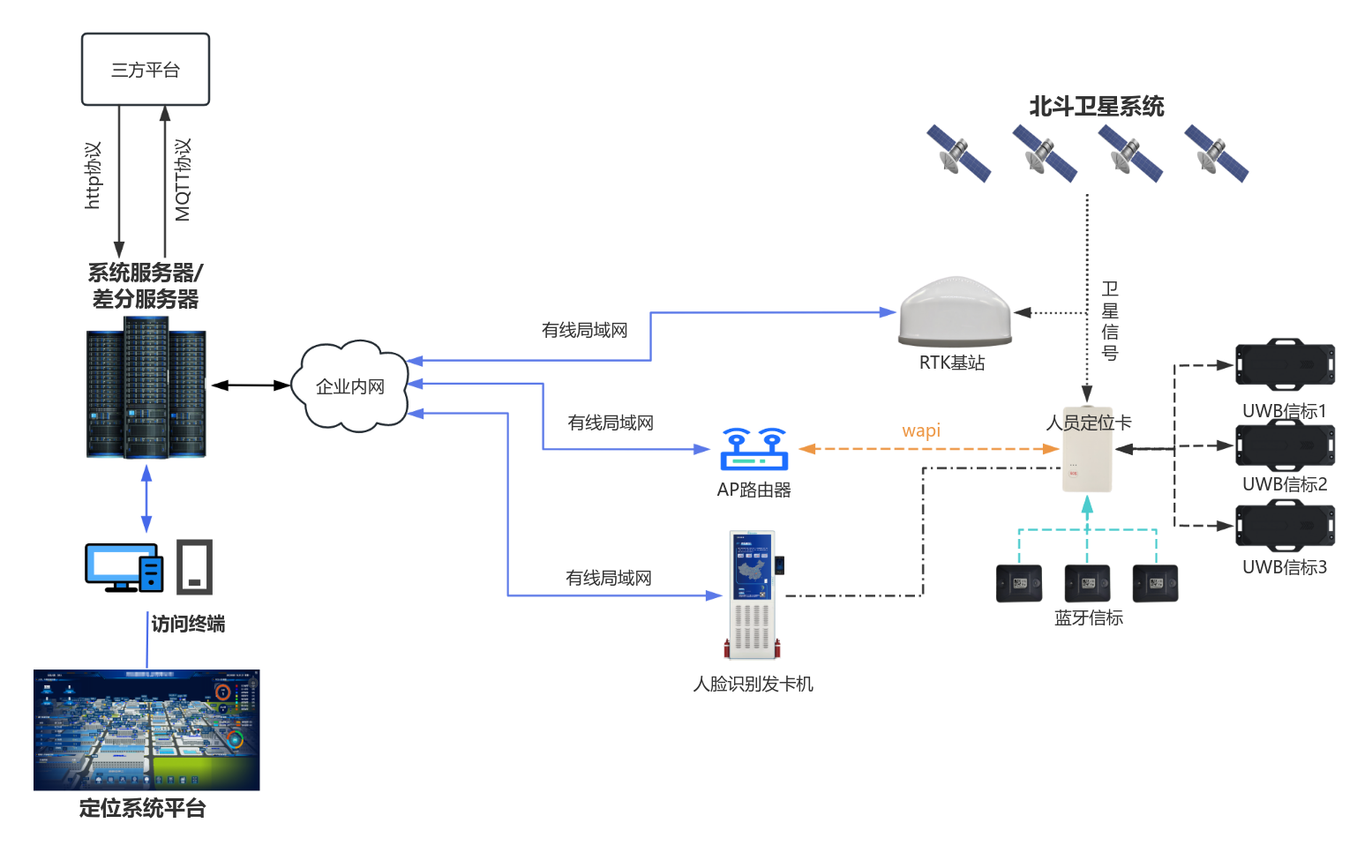 該系統(tǒng)的核心競(jìng)爭(zhēng)力在于突破性的多技術(shù)融合架構(gòu),針對(duì)化肥廠室內(nèi)外差異化環(huán)境、不同風(fēng)險(xiǎn)區(qū)域的定位需求,實(shí)現(xiàn)了全場(chǎng)景無(wú)縫覆蓋與精度動(dòng)態(tài)適配。在廠區(qū)開(kāi)闊區(qū)域,如原料堆場(chǎng)、運(yùn)輸主干道、罐區(qū)外圍等,系統(tǒng)采用北斗RTK技術(shù)構(gòu)建基礎(chǔ)定位網(wǎng)絡(luò)。北斗系統(tǒng)作為我國(guó)自主可控的衛(wèi)星導(dǎo)航技術(shù),具備全天候、抗干擾的穩(wěn)定服務(wù)能力,結(jié)合RTK實(shí)時(shí)動(dòng)態(tài)差分技術(shù),可通過(guò)基準(zhǔn)站與移動(dòng)終端的實(shí)時(shí)數(shù)據(jù)交互,消除干擾因素,確保室外人車定位的高精度輸出,為車輛調(diào)度、室外巡檢路線監(jiān)控提供可靠數(shù)據(jù)支撐。