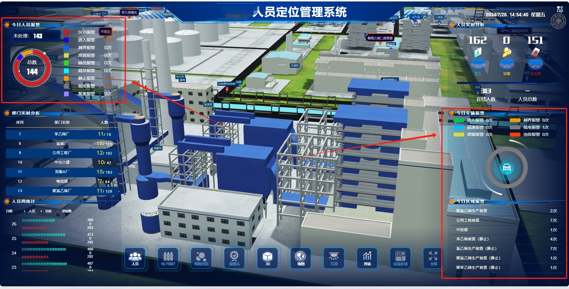 圍繞化肥廠安全管理的全流程需求,系統(tǒng)構(gòu)建了實(shí)時(shí)監(jiān)控、風(fēng)險(xiǎn)預(yù)警、應(yīng)急處置、數(shù)據(jù)追溯的閉環(huán)功能體系。在實(shí)時(shí)監(jiān)控層面,系統(tǒng)通過(guò)2D/3D可視化管理平臺(tái),動(dòng)態(tài)展示廠區(qū)內(nèi)人員、作業(yè)車輛、運(yùn)輸車輛的分布位置,支持按車間、工種、車輛類型進(jìn)行分類篩選,管理人員可直觀掌握各區(qū)域人車密度,避免超員作業(yè)或人員不足導(dǎo)致的管理漏洞。針對(duì)巡檢工作,系統(tǒng)可實(shí)時(shí)追蹤巡檢人員與巡檢車輛的移動(dòng)軌跡,記錄到達(dá)時(shí)間、停留時(shí)長(zhǎng)、作業(yè)順序等關(guān)鍵數(shù)據(jù),從技術(shù)層面杜絕漏檢、虛檢等問(wèn)題。