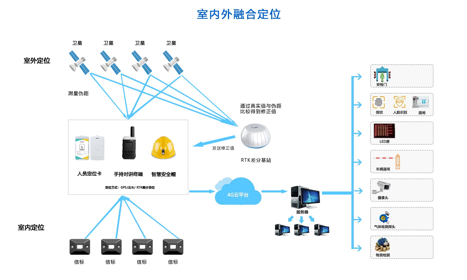 室外基于GPS/北斗RTK差分技術(shù)進(jìn)行定位,利用RTK差分定位基站提升GPS/北斗衛(wèi)星定位的精度,在室外架設(shè)一臺(tái)已知坐標(biāo)的差分定位基站,差分定位基站根據(jù)已知坐標(biāo)和自己觀(guān)測(cè)到的衛(wèi)星定位數(shù)據(jù)求出修正值,并將修正值發(fā)送給定位終端(比如人員定位卡),定位終端利用差分基站發(fā)送的修正值,對(duì)自己觀(guān)測(cè)到的衛(wèi)星定位數(shù)據(jù)進(jìn)行修正,從而實(shí)現(xiàn)精確定位。